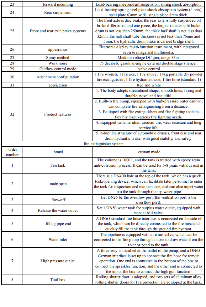 Ito ay perpektong inangkop sa mga pangangailangan ng fire-fighting ng mga maliliit na lugar tulad ng mga pamayanan ng lunsod, bayan at nayon, mga nakamamanghang parke, atbp. Ito ay isang mahalagang kagamitan para sa pagbuo ng isang "buong saklaw, mabilis na pagtugon" na sistema ng sunog na sunog, at epektibong bumubuo para sa mga pagkukulang ng mga malalaking trak ng sunog sa patlang na lumalaban sa sunog.